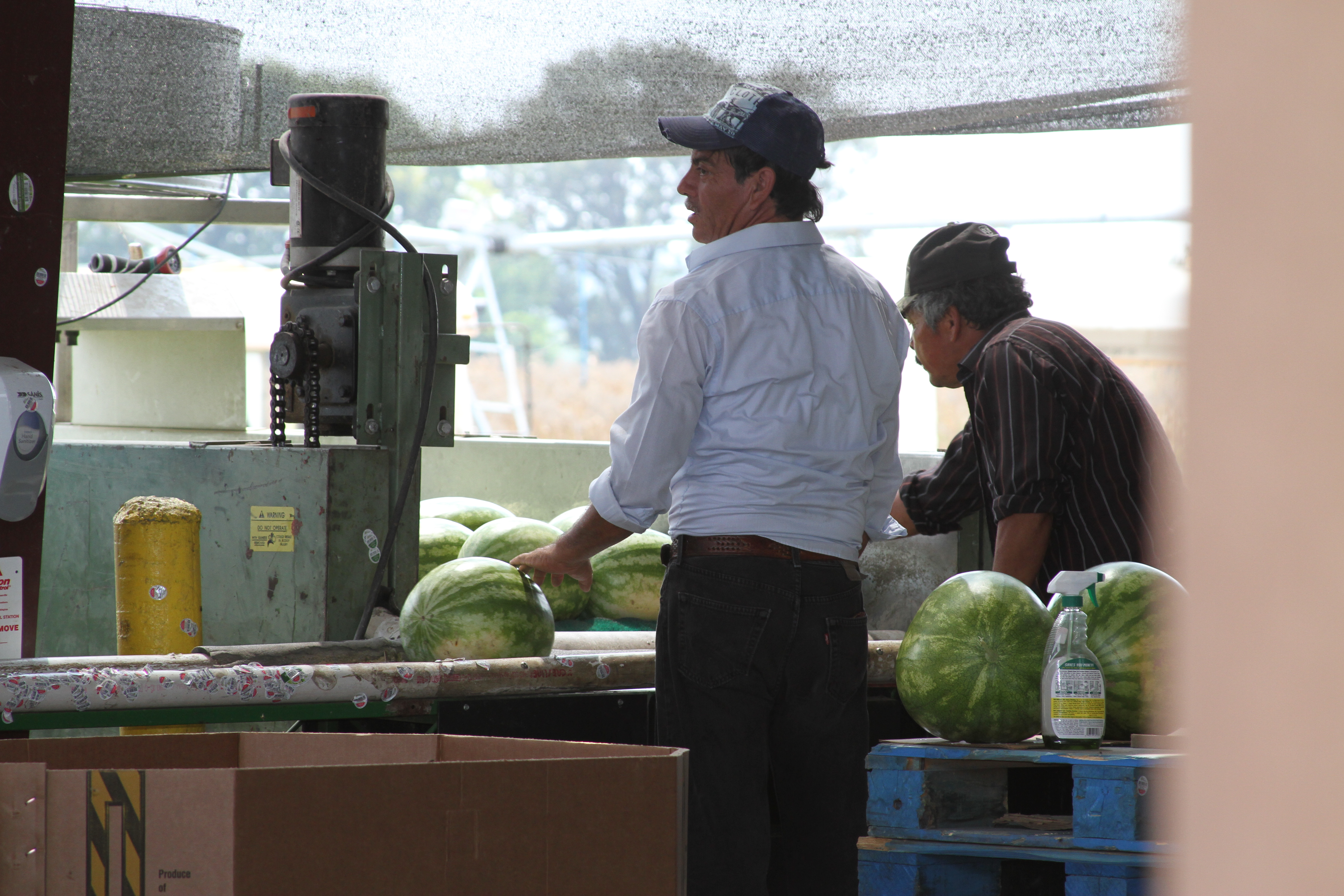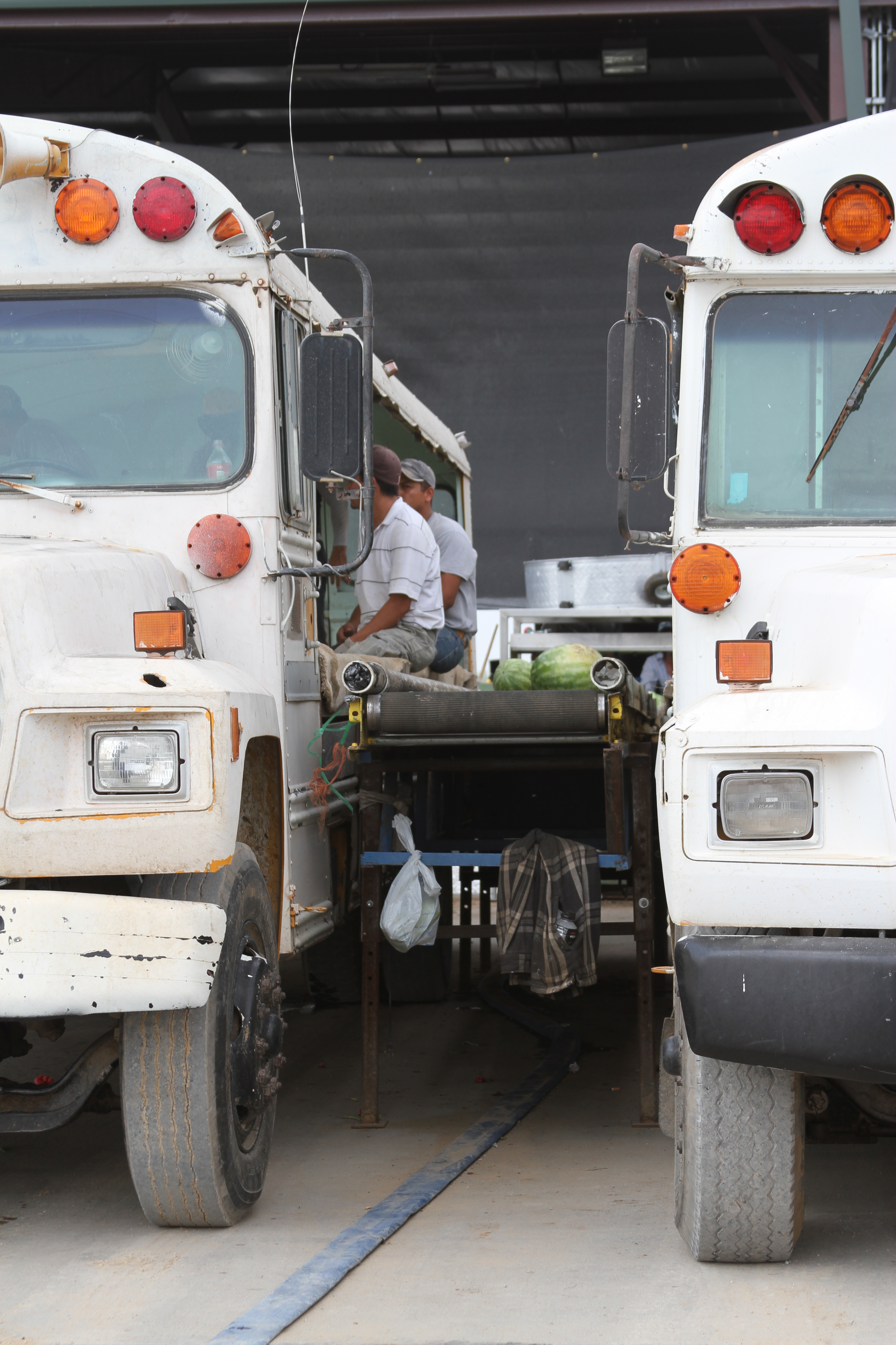 All of the watermelons are picked and loaded onto buses. Once back at the packaging facility, the watermelons are unloaded.